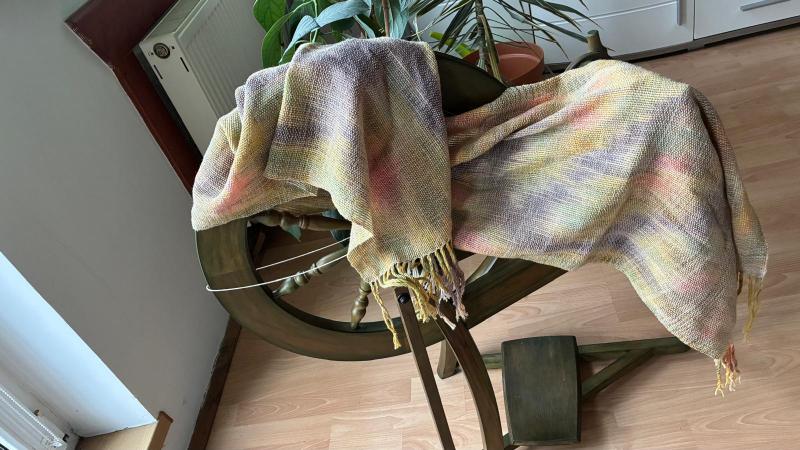 Samotné tkaní přineslo i momenty hledání. Původní záměr zvýraznit listy ručně upředenou přízí nevedl k očekávanému výsledku, a tak přišlo na řadu párání a nová cesta. Ve finální verzi byla použita jemná světlá příze, která motiv nepřebila, ale naopak jej zjemnila. Šála byla nakonec utkána plátnovou vazbou a působí harmonicky a lehce.